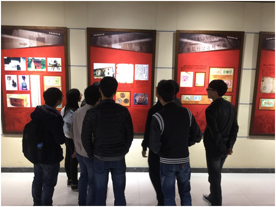 一进入充满了红色气息的展馆,同学们迅速被精美的展板所吸引。以1926年10月湖南省衡山县柴山洲特区第一农民银行发行壹元布币为起点,同学们认真阅读了各展板的内容,透过一段段淳朴的文字与一张张沧桑的图片,同学们深刻了解了当年红色货币的发展变迁史。参观过程中,同学们一个个表情专注,经常三五成群停留在展板前一块交流讨论:或感慨战时经济运行之艰难,或追思先前英烈之无畏,或叹服红军金融手段之巧妙,或敬佩革命事业之伟大。