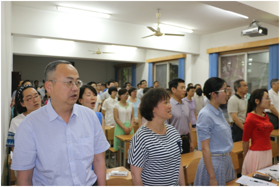 大会开始,全体党员起立唱国歌