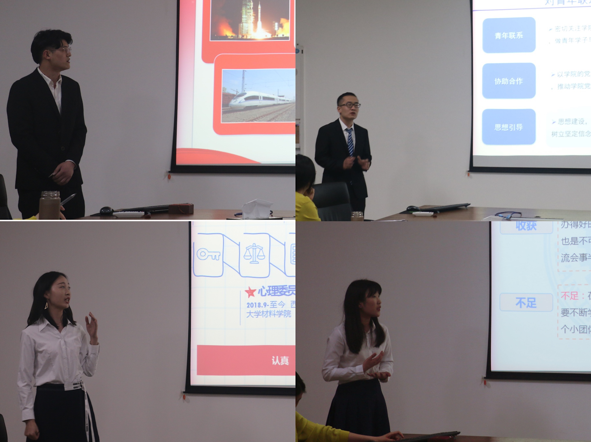 会议在激昂的国歌中拉开了序幕,学院团工委副书记葛益和党建工作组组长张建飞分别做了年度工作总结汇报。葛益分享了自己一年在团工委副书记这个工作岗位上的收获和体会,并强调了这个职位的重要性和关键性。他指出,“学生组织是学院工作的中坚力量和强大帮手,希望大家共同努力,创造3003新葡的京集团更加辉煌的明天。”张建飞主要介绍了党建工作组一年以来的工作完成情况以及举办的一些特色活动,“西迁”精神学习系列活动;支部标准化建设;构建活力党建活动,党建学习参观系列活动、宣传技能培训系列活动、专题辩论赛等等。对于新一届的党建工作组,张建飞表示,“团结一致,共同奋进,形成一个极具凝聚力的团体,发挥组员引领、示范作用,传播正能量。”