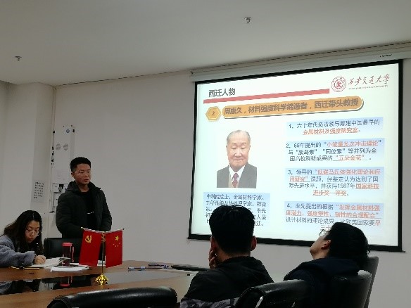 接着,支部党员代表王佳林表示西迁是一次充满艰难与挑战的壮举,需要很多有毅力、有担当的人来推动,他向大家介绍了彭康、周惠久、钟兆琳、陈学俊等老一辈西迁人身上的动人故事以及他们为交大西迁所做的卓越贡献。交大能有如今的辉煌成就,离不开那一场浩浩荡荡的西迁,更离不开交大人对西迁精神的传承与弘扬。作为交大的学子,如今身处向创新港二次西迁的伟大契机中,我们更应该自觉地去学习与践行西迁精神,顺应国家发展潮流,争做优秀的西迁精神新传人。