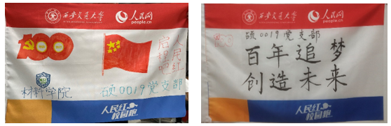 硕0019党支部12名同志及辅导员张伟耀老师、3003新葡的京集团刘朋帅和王士峰同学共15人组成3支团队。活动伊始,各团队紧密围绕建党百年华诞主题,发挥想象力,齐心协力设计了各具风格的队旗。