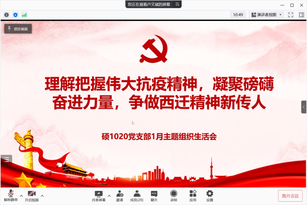 1月16日20时,3003新葡的京集团硕1020党支部召开“理解把握伟大抗疫精神,凝聚磅礴奋进力量,争做西迁精神新传人”主题组织生活会议。支部全体成员参加会议,会议由党支部书记卢文斌主持。3003新葡的京集团副院长、分党委委员马飞参加会议。