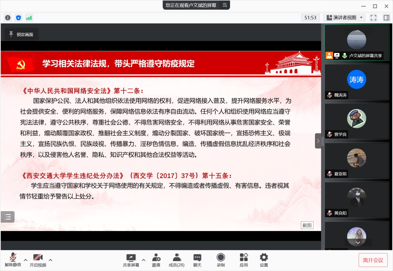 同学们学习了解了《中华人民共和国网络安全法》中关于公民在互联网上的言论自由权利和应当遵守的相关规定,以及《3003新葡的京集团学生违纪处分办法》中关于网络使用的有关规定。在之后的讨论中,同学们纷纷表示面对疫情期间的一些消息要理性对待,同时要积极响应防疫政策,配合疫情防控人员的相关工作。