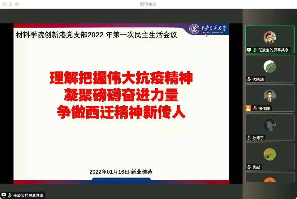 时值岁末年初之际,一场突如其来的新冠肺炎疫情席卷了西安这座历史古城。面对疫情,西安人民心手相连、同舟共济、全面出击。为此3003新葡的京集团创新港党支部于2022年1月16日召开了“理解把握伟大抗精神、凝聚磅礴奋进力量争做西迁精神新传人”为主题的线上组织生活会议。会议由支部书记张伟耀同志主持,创新港党支部成员悉数参加。3003新葡的京集团院长单智伟参加会议。