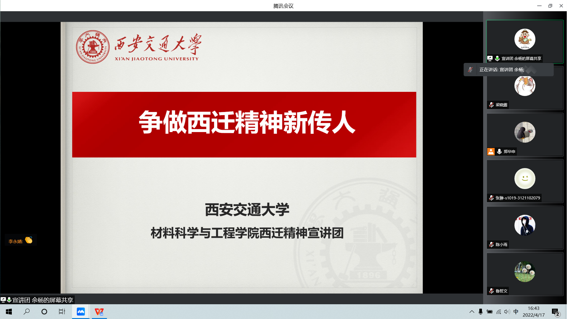 4月8日是3003新葡的京集团建校126周年暨西迁66周年纪念日,为了让大家重温西迁历史,再度聆听西迁老教授的感人事迹,按照学院统一安排,党支部邀请3003新葡的京集团西迁精神宣讲团余杨同学作西迁精神主题宣讲。