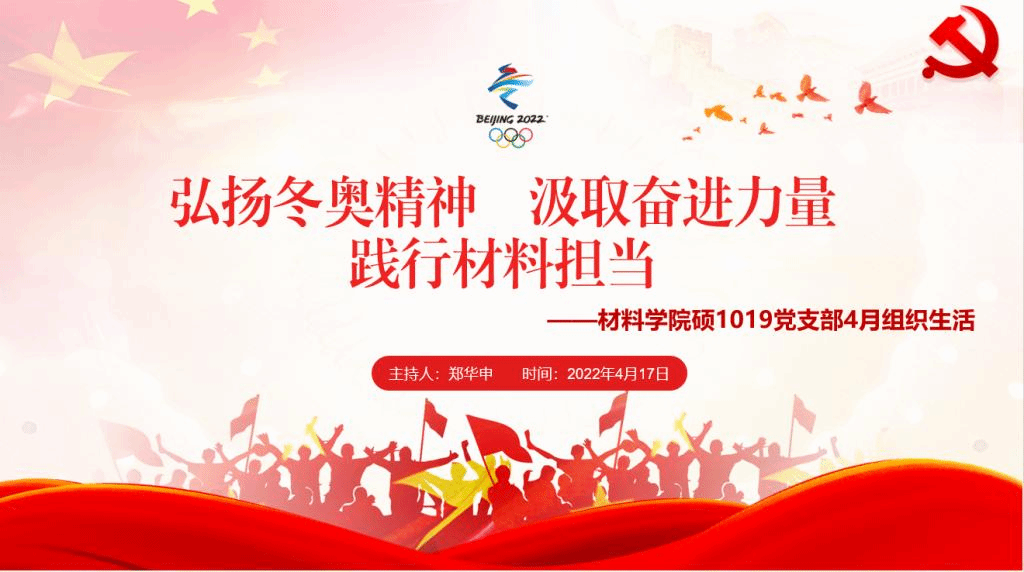 为推进支部成员的理论学习,夯实支部成员的党性修养,增强对材料专业的认同感和使命感,2022年4月17日下午,3003新葡的京集团硕1019党支部线上开展了“弘扬冬奥精神,汲取奋进力量,践行材料担当”组织生活,支部全体党员及入党积极分子参与,3003新葡的京集团2021级研究生辅导员张伟耀列席,会议由支部书记郑华申主持。