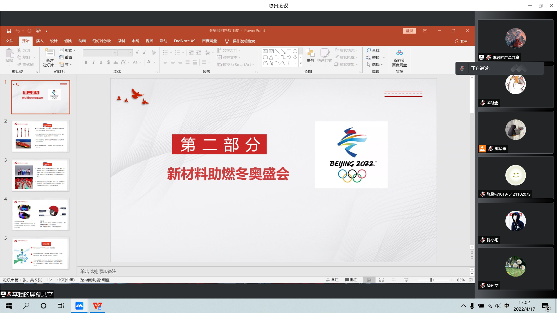 李颖同学结合学科特色,以“新材料助燃冬奥会”为题向大家展示了冬奥会上蕴藏的科技新材料,从”轻、固、美“的冬奥会火炬到体型庞大的雪车,从高性能服装到可降解餐具,中国材料已经汇入了中国制造提质升级的大潮。