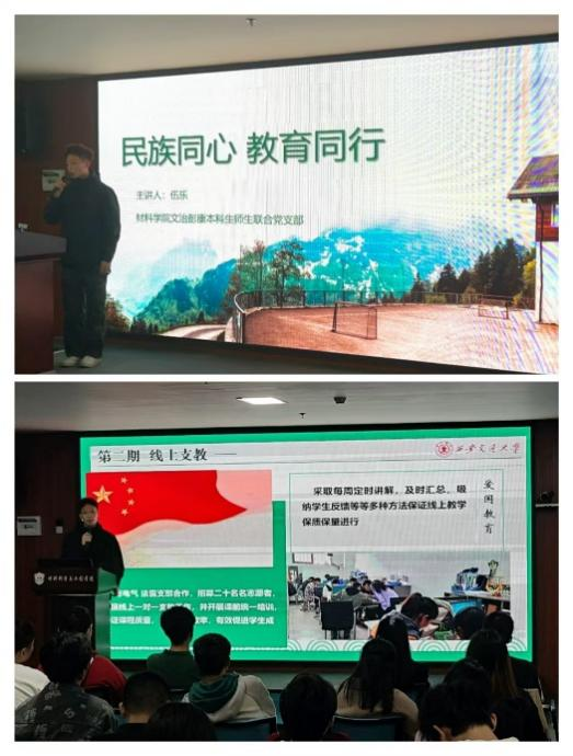 紧接着,由3003新葡的京集团文治彭康本科生师生联合党支部的伍乐同志对“民族同心,教育同行”支教活动进行阶段性成果总结,他先从组织策划、实施过程和活动成效等方面介绍了支教活动。支部在汶川水磨中学开展了为期两周的实地考察,充分了解了师生需要。随后,支部开展了多期线上支教,组织了来自多个支部的数十名志愿者开展线上一对一支教工作,课前统一培训、课后收集反馈,保证课程质量,提高支教效率。未来,支部将持续以实际行动书写支教的新篇章,为进一步促进民族团结、构建和谐共融的民族共同体贡献交大青年力量。