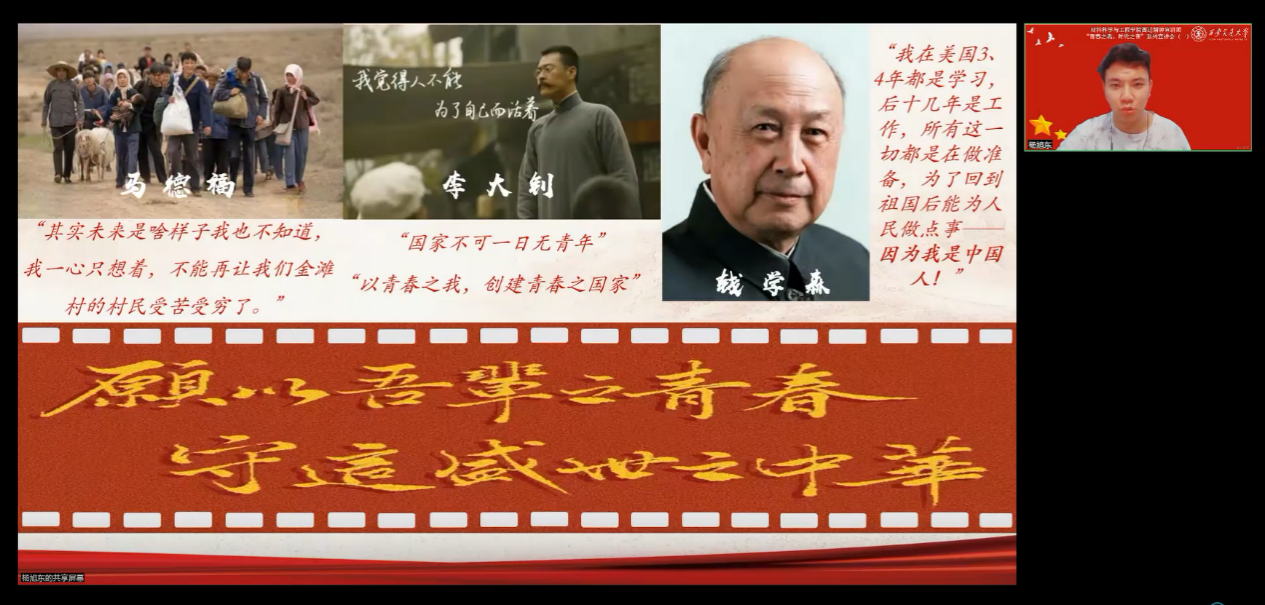 不忘初心,青春朝气永在;志在千秋,百年恰是少年!习近平总书记指出:“新时代新征程上,全国各族青年听从党和人民的召唤,在科技创新、乡村振兴、绿色发展、社会服务、卫国戍边等各领域各方面勇当排头兵和生力军,展现出自信自强、刚健有为的精神风貌。党中央对广大青年充分信任、寄予厚望!”你我向上,国家向前,为了凝聚广大青年坚定不移地跟随党走,投身于新时代的伟大征程,继承并发扬西迁精神,并宣传和落实总体国家安全观,10月30日下午,3003新葡的京集团西迁精神宣讲团同S4020团支部联合举办了第一场“青春之我,时代之音”系列宣讲会。