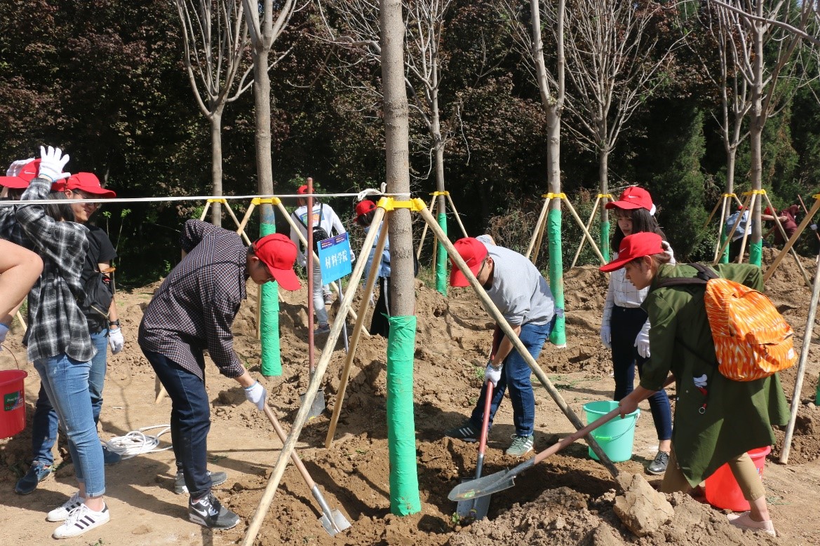 在专业人员的指导下,团队成员利用吊车将树吊起并调整角度移入坑内,在树干上绑好绳子后从三个方向拉紧固定,防止在填土过程中树干发生倾斜,最后在其表层土壤做出水圈进行浇水,按部就班完成植树工作。当第一棵树苗种植成功,学院研究生代表张庆庆同学激动的表示,“六十多年前,我们的前辈在交通大学本部校区种下的梧桐已经长成了参天大树,它们是交大西迁后历史的见证。今天,交大材料学子种下七叶树,伴随着它的茁壮成长,相信一定会成为西部创新港的崛起见证。”