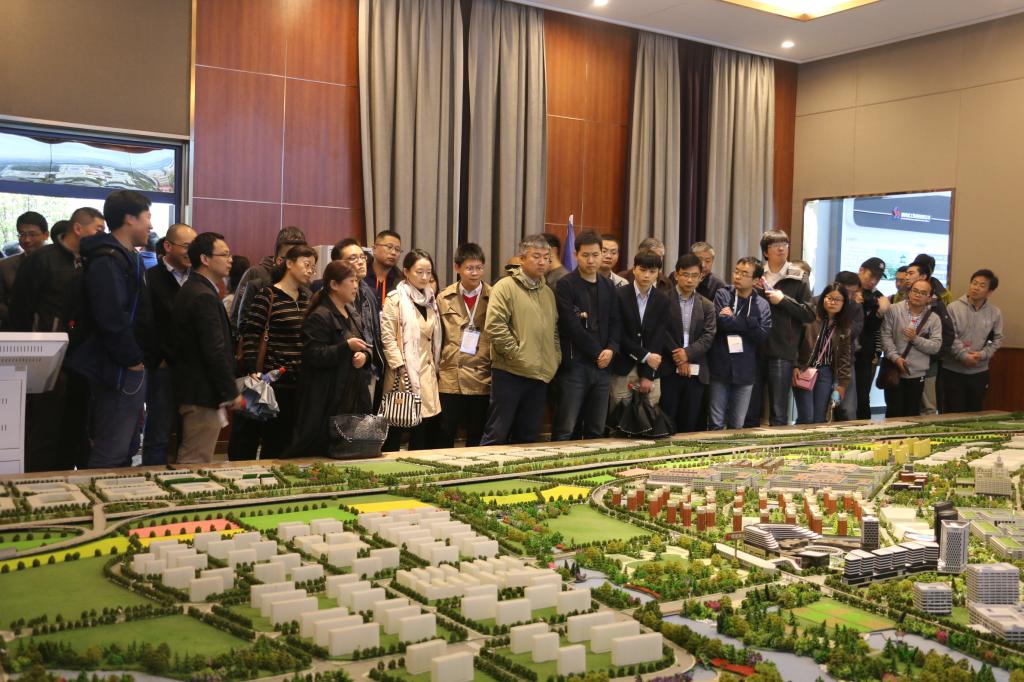 在创新港工作人员陪同下,大家首先参观了创新港智慧展厅,聆听了创新港的独特区位、便利交通、定位目标、建设内容、规划设计、项目进度等情况介绍。在沙盘前,工作人员进一步向大家介绍了创新港一廊三核四绿楔的总体规划,细致讲解教学科研楼宇分布状况以及周边河流、湿地的分布情况。