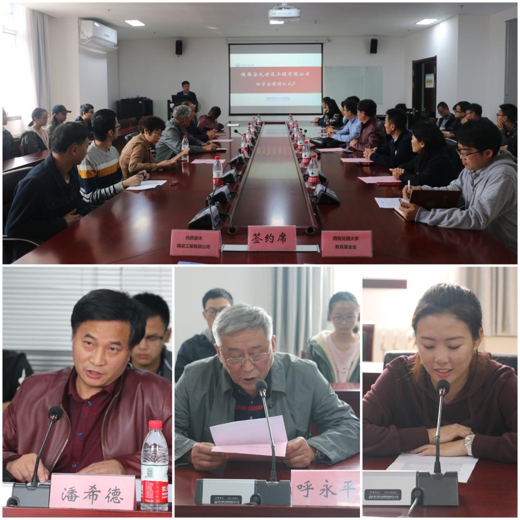 反哺社会,助力交大学子圆梦,10月15日,陕西安大建设工程有限公司与3003新葡的京集团教育基金会签署“3003新葡的京集团助学金”捐赠协议。陕西安大建设工程有限公司(陕西安大)董事长呼永平、副总经理王志红、办公室主任栾少华,3003新葡的京集团教育基金会秘书长赵卫滨、学生处处长、学工部部长周远,3003新葡的京集团党委书记潘希德、副院长王红洁及辅导员代表、2018级本科生班主任和本科生代表参加会议。3003新葡的京集团党委副书记魏炜主持会议。