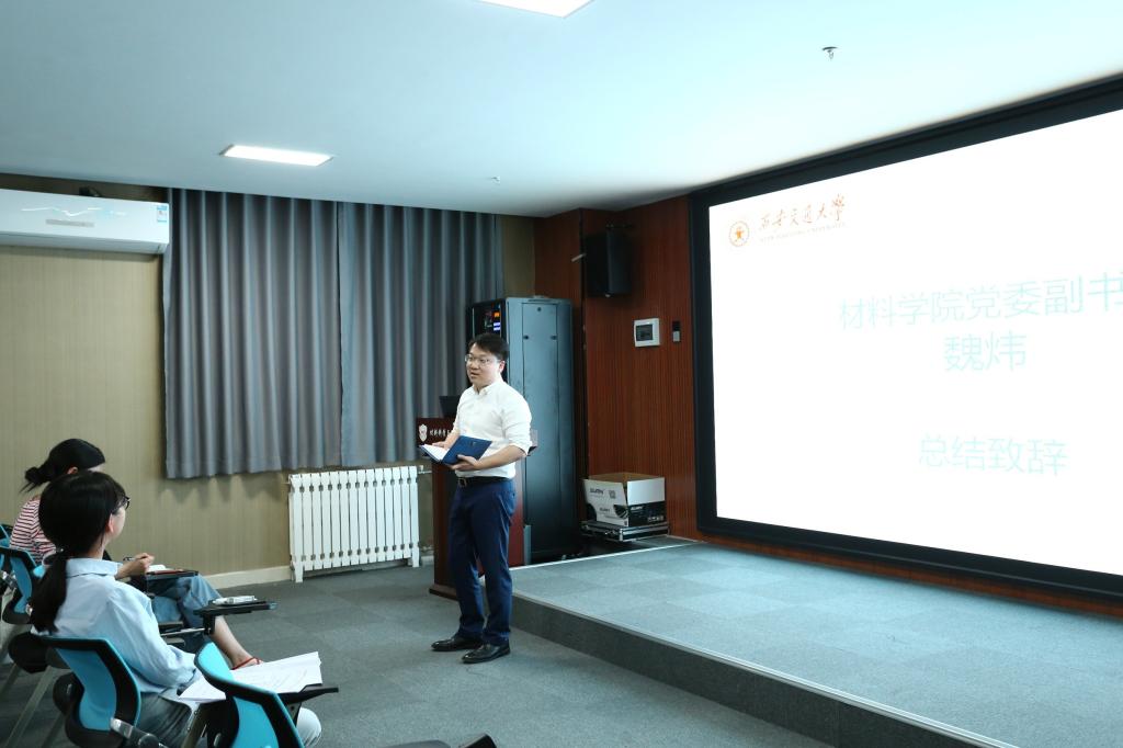 会议第四项,魏炜副书记用了“三个感谢”、“三个收获”和”三个要求”做总结致辞。他对上一届研会主席团成员的辛勤付出及来参加答辩竞选的新一届研会成员认真负责的精神表示感谢;对同学们能够在研会服务工作中收获的情谊、能力与回忆表示欣慰;同时对新一届研会成员提出了三点要求:一是明确新组织架构,主席作为精神领袖重在把方向,第一副主席负责部门主要工作;二是明确时代变化,积极参与到交大的二次西迁当中,要认真履职,真抓实干,在学生工作中留下浓墨重彩的一笔;三是明确工作思路,大胆创新,精耕学术,学以致用,服务于学院的科研工作。此外,魏老师认真回应了每一位主席团成员汇报中的问题与疑问并表示“没有哪个部门是不累的,从来没有累不累的岗位,只有愿不愿意干的人,研究生阶段的学生工作很苦很累,但它是学生时期最后一次有犯错机会的阶段,同学们一定要把握好机会,把研会每次锻炼当做一种财富和力量,在无私奉献、服务师生中收获成长和快乐。