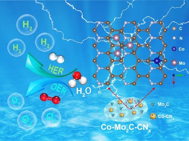 研究团队通过异质界面构筑策略,开发了一种HER/OER双功能全分解水电催化剂。通过对Co-Zn双金属有机框架进行碳化,制备出氮掺杂的多孔碳包裹的Co-Mo2C异质结构电催化剂材料(Co-Mo2C-CNx)。理论计算发现,所构筑的双Mott–Schottky异质界面有利于载流子迁移,促进带电荷激活和转移,提升电催化活性。在碱性介质中,10 mA cm-2时材料的HER和OER过电位分别为92 mV和338 mV,全分解水的驱动电位为1.68 V,经20 h测试后仍表现良好的稳定性,是一种极具潜力的电解水催化剂。研究成果以“Nitrogen-doped carbon wrapped Co-Mo2C dual Mott–Schottky nanosheets with large porosity for efficient water electrolysis”为题在Applied Catalysis B: Environmental(IF=19.503)在线发表(https://doi.org/10.1016/j.apcatb.2020.119738)。