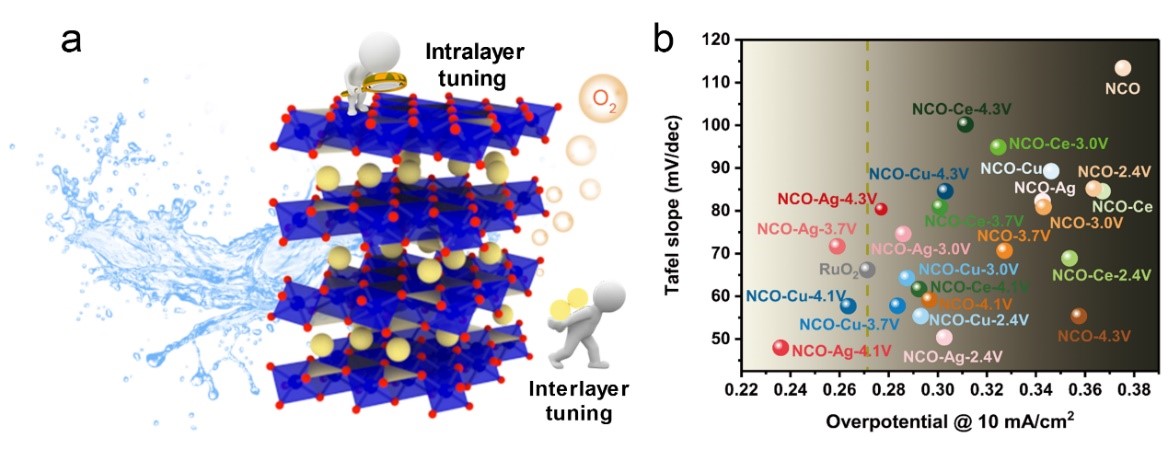 研究团队还基于晶格应力与原子替位的协同调控效应设计开发了一种高效稳定的OER析氧催化剂——层状钴酸钠基材料。利用层间碱金属离子电化学脱出过程引起晶格膨胀及面内收缩,连续调控材料的晶格应力,优化含氧中间体的吉布斯自由能,进一步通过低价态金属离子替代钴Co离子而提高Co的价态,利用高价态Co4+和Co(4+ɛ)+强的电子接收能力加速析氧反应。所制备材料展现出优于商用RuO2催化剂的析氧反应过电位(236 mV, 电流密度10 mA·cm-2)和较小的塔菲尔斜率 (48 mV·dec–1),且稳定性良好,对开发低成本、高效能的析氧电催化剂具有重要的借鉴意义。研究成果以“Lattice strain and atomic replacement of CoO6 octahedra in layered sodium cobalt oxide for boosted water oxidation electrocatalysis”为题在Applied Catalysis B: Environmental(IF=19.503)在线发表(https://doi.org/10.1016/j.apcatb.2021.120477)。