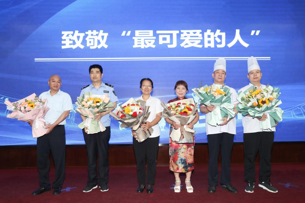 学院特邀学校后勤保障工作人员——葆力物业兴庆校区仲英楼主管陈天才、保卫处兴庆校区西南门班长蔡耕、本科生东20舍宿管李院利、研究生西9舍宿管张颖、康桥苑副经理万锋、康桥苑学3、学4窗口工作人员丁亚洲至现场,作为本次学位授予仪式的特别惊喜环节。毕业生代表们逐一上台为其献花,致敬这些承载着青春回忆的“最可爱”“最可亲”的人,感恩他们日复一日的陪伴,守护着同学们安全、快乐、无忧地成长。