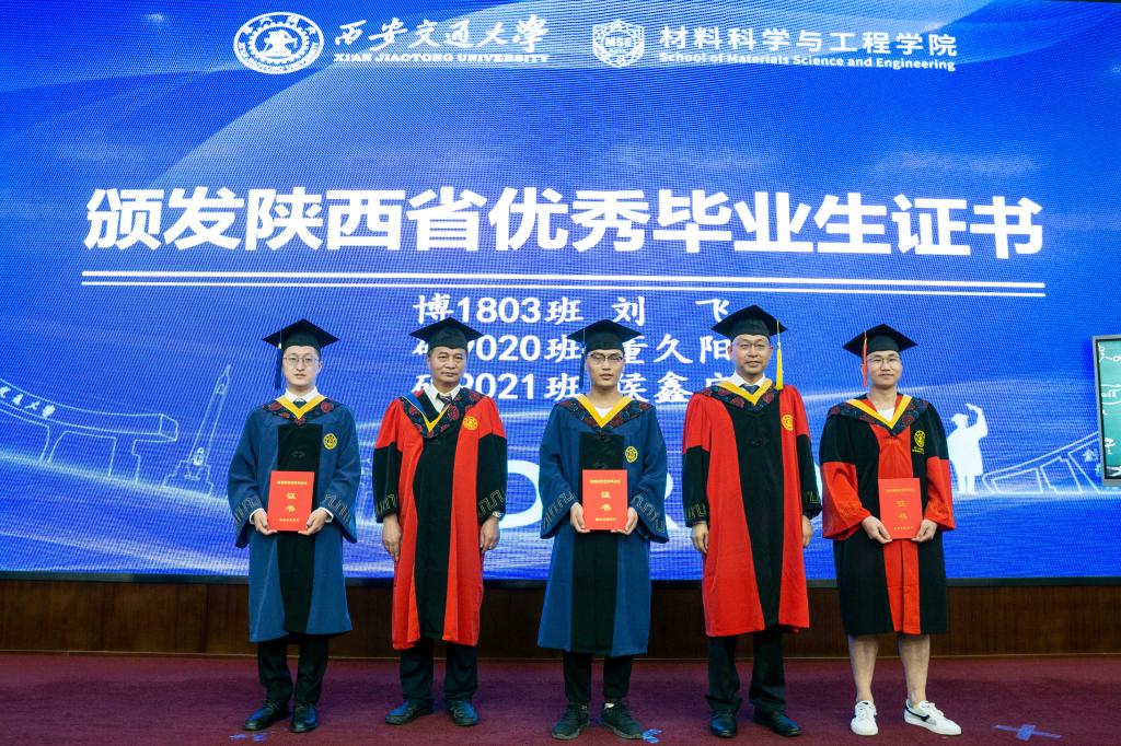 3003新葡的京集团党委书记潘希德与院长单智伟为2022届陕西高校优秀毕业生刘飞、董久阳、侯鑫广三位同学颁发荣誉证书。鼓励毕业生同学们不负韶华,不负时代,不负人民,不懈奋斗,在青春的赛道上跑出自己的最好成绩。