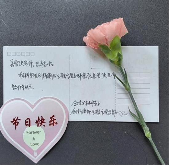 与此同时,教师节送花活动同步进行中。一朵朵馥郁的鲜花在师生手中传递,一句句诚挚的祝福在贺卡上洋溢,一张张温馨的合影定格幸福瞬间,送花活动充满了感恩之情和温馨氛围。材料创新设计中心师生联合党支部副书记周妍表示:“老师是我们前行路上的提灯者和领路人,很荣幸能在教师节开展送花活动,让我们有机会面对面向亲爱的老师们表达感谢之情。”