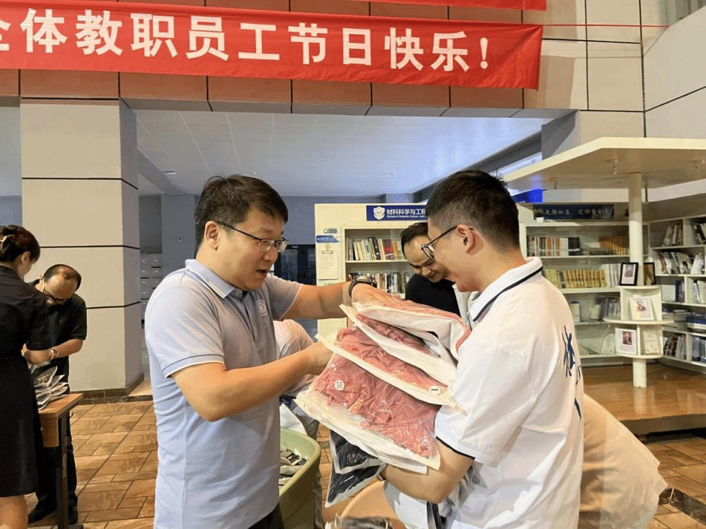 当天下午,在仲英楼二楼大厅,“温暖”传递在每位教师的心间。学院党委书记高宏、副书记魏炜为学院教师送上量身定制的院服,该院服由材料学科校友会会长、陕西斯瑞新材料股份有限公司董事长王文斌捐赠,穿上专属于材料人的院服,传承材料人坚韧不拔的精神,教师们谆谆教诲和殷殷嘱托指引着一代代学生努力成长为堪当大任的时代新人,感谢教师们为教书育人工作作出的贡献,向他们致以崇高的敬意。