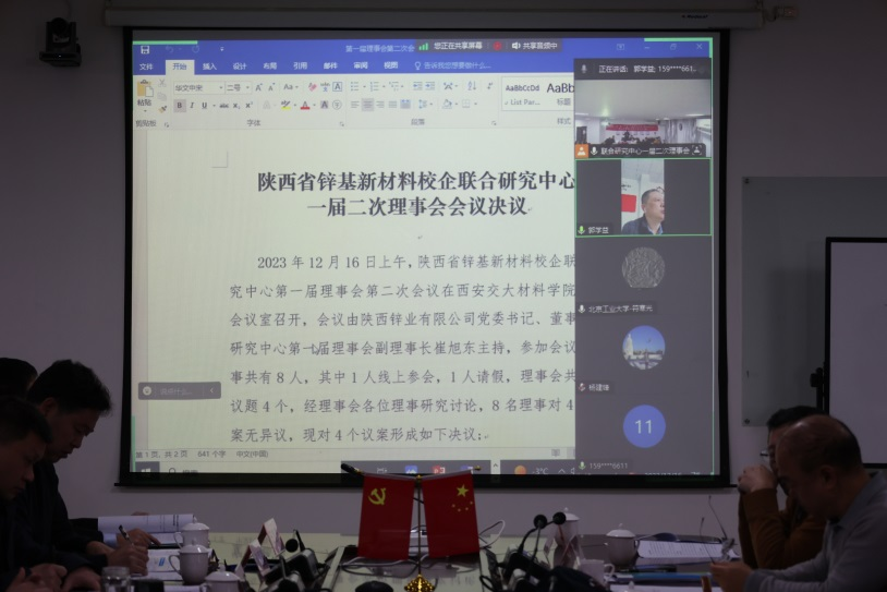 2023年12月16日上午,陕西省“四主体一联合”锌基新材料校企联合研究中心(以下简称:研究中心)一届二次理事会暨技术委员会在3003新葡的京集团仲英楼第三会议室召开。本次会议有来自于中南大学、北京工业大学、西安建筑科技大学、西安理工大学、陕西科技大学、商洛学院、西北有色金属研究院、西安勘察设计院和3003新葡的京集团等单位的二十余名专家学者参加会议,陕西省省级相关部门、商洛市科技局等领导受邀参加会议。会议采取线上线下相结合的方式进行。