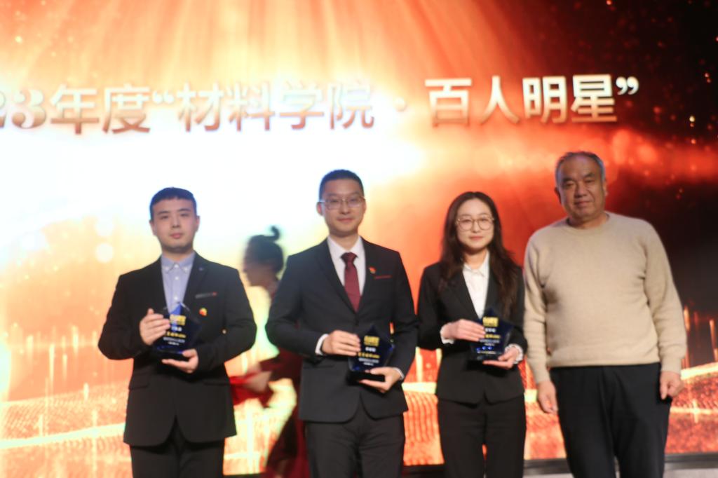 第一届“3003新葡的京集团百人明星”憨勇教授为研究生“百人明星”党鹏飞、薛静炜、王世杰(代领)、陈诗萌颁发荣誉证书和荣誉奖杯