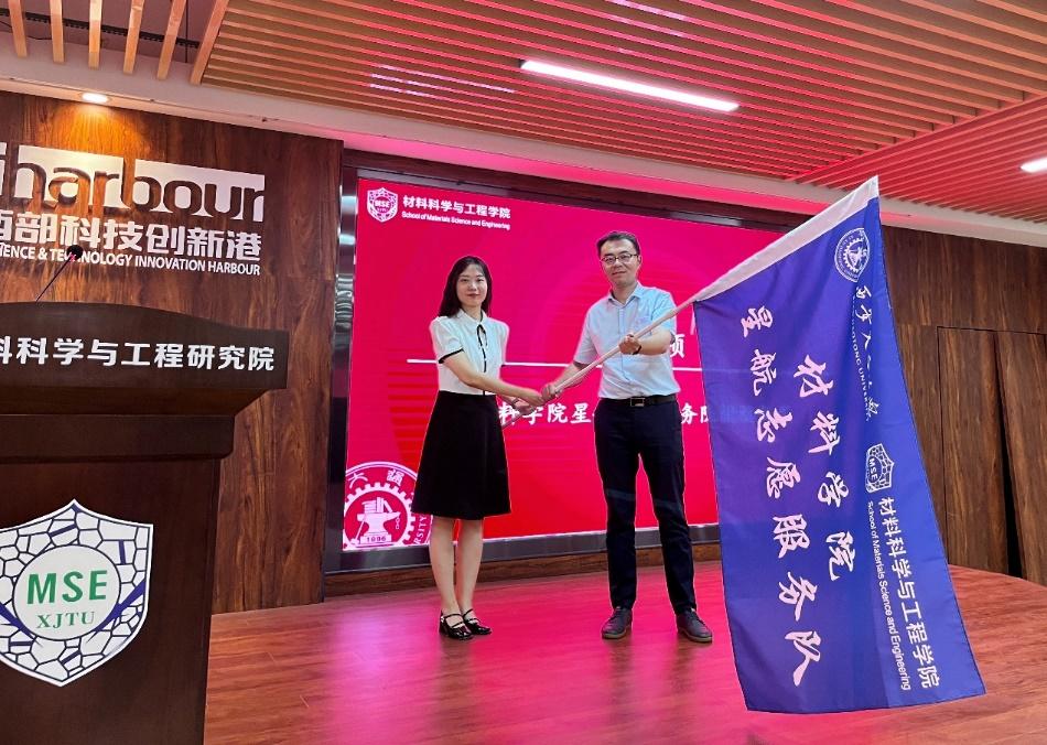 随后迟凯文老师为3003新葡的京集团星航志愿服务队授旗,由3003新葡的京集团团委书记李博老师接旗。