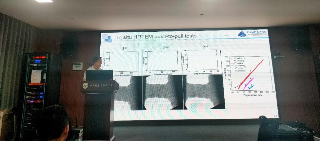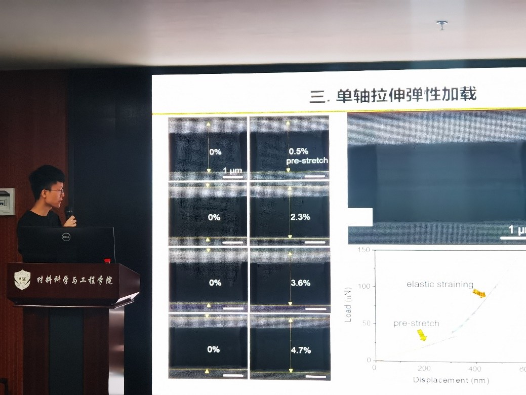 西安电子科技大学的曹可副教授报告了“涂层薄膜材料力学行为的原位电镜研究”。分别介绍了原位扫描电镜及透射电镜的力学测试方法在石墨烯和YTaO4铁弹的力学性能研究中的应用。