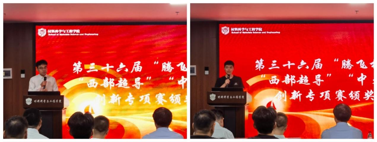 “西部超导”和“中天钢铁”创新专项赛获奖团队代表裴智明、张崇乐两位同学依次发言,分享了获奖项目创新点与参赛收获,并向支持赛事发展的两家企业、指导教师和团队成员表达了诚挚感谢。他们的发言展现了交大学子扎实的学术功底、敏锐的创新意识和勇于担当的精神风貌。