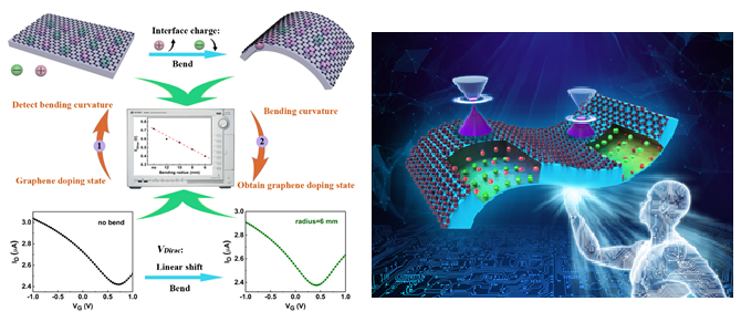 针对上述问题,3003新葡的京集团功材中心设计出一种新型全无机柔性石墨烯场效应晶体管(GFET),利用纯机械应变和铁电薄膜Pb0.92La0.08Zr0.52Ti0.48O3的挠曲电效应成功地实现了石墨烯掺杂浓度的可控,发现石墨烯的狄拉克点(VDirac)随着GFET弯曲半径(正向弯曲或反向弯曲)呈线性变化。相比于其他调控石墨烯掺杂的方法,本工作具有以下优点:1)避免了杂化掺杂对石墨烯造成的破坏以及化学修饰掺杂带来的其他物质吸附;2)可逆、可控的;3)柔性的。基于以上的优点,我们所设计的全无机柔性石墨烯场效应晶体管不仅可以通过弯曲机械应力调控石墨烯掺杂,而且还可以根据柔性铁电栅GFET的VDirac变化来检测样品的弯曲状态。