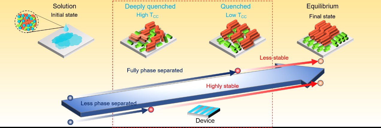 近年来,非富勒烯聚合物太阳能电池以其优异的性能得到了快速进展。然而,面对成千上万的给体和受体材料,合理选择相匹配的材料组合,并快速优化及保持给受体共混薄膜的微观形貌是提高器件能量转化效率和稳定性的关键。然而,长期以来材料组合的选择、形貌优化过程一直采用大量的重复试验和低效的盲目试错。其中的一个重要原因是微观形貌的精细化表征非常困难,通常需要借助于复杂的同步辐射X射线技术。科研人员巧妙地将差热式扫描量热计(DSC)第一次加热过程中获得的冷结晶温度,与X射线技术获得微观相分离结构建立了对应关系。该方法极大的简化了形貌表征和优化的过程,并且为材料组合的选择及形貌优化的策略提供了明确的方向。