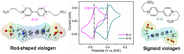 紫精类氧化还原活性分子以其成本低、水溶性高、氧化还原可逆性好等特点,是迄今用于水系有机液流电池负极活性材料的最优选择之一。然而,水溶性紫精分子体积较小,易在电池循环过程中穿透隔膜发生渗透;同时,还原态紫精自由基分子稳定性差,容易发生结构异化。这些不利因素导致紫精类水系液流电池容量衰减快、服役寿命短,极大限制了其规模化应用。