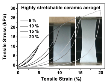陶瓷气凝胶兼具低密度、低热导率及优异的热稳定性,是一种良好的隔热材料。传统的陶瓷气凝胶由氧化物纳米颗粒构成,颗粒间仅靠缩颈实现连结,往往具有脆性。以陶瓷柔性纳米结构构筑气凝胶,可实现其压缩回弹性,但在拉应力作用下,这类气凝胶一般表现为脆性断裂。因此,开发兼具压缩和拉伸回弹性的陶瓷气凝胶,对于满足其在复杂应力环境中的应用十分必要。
