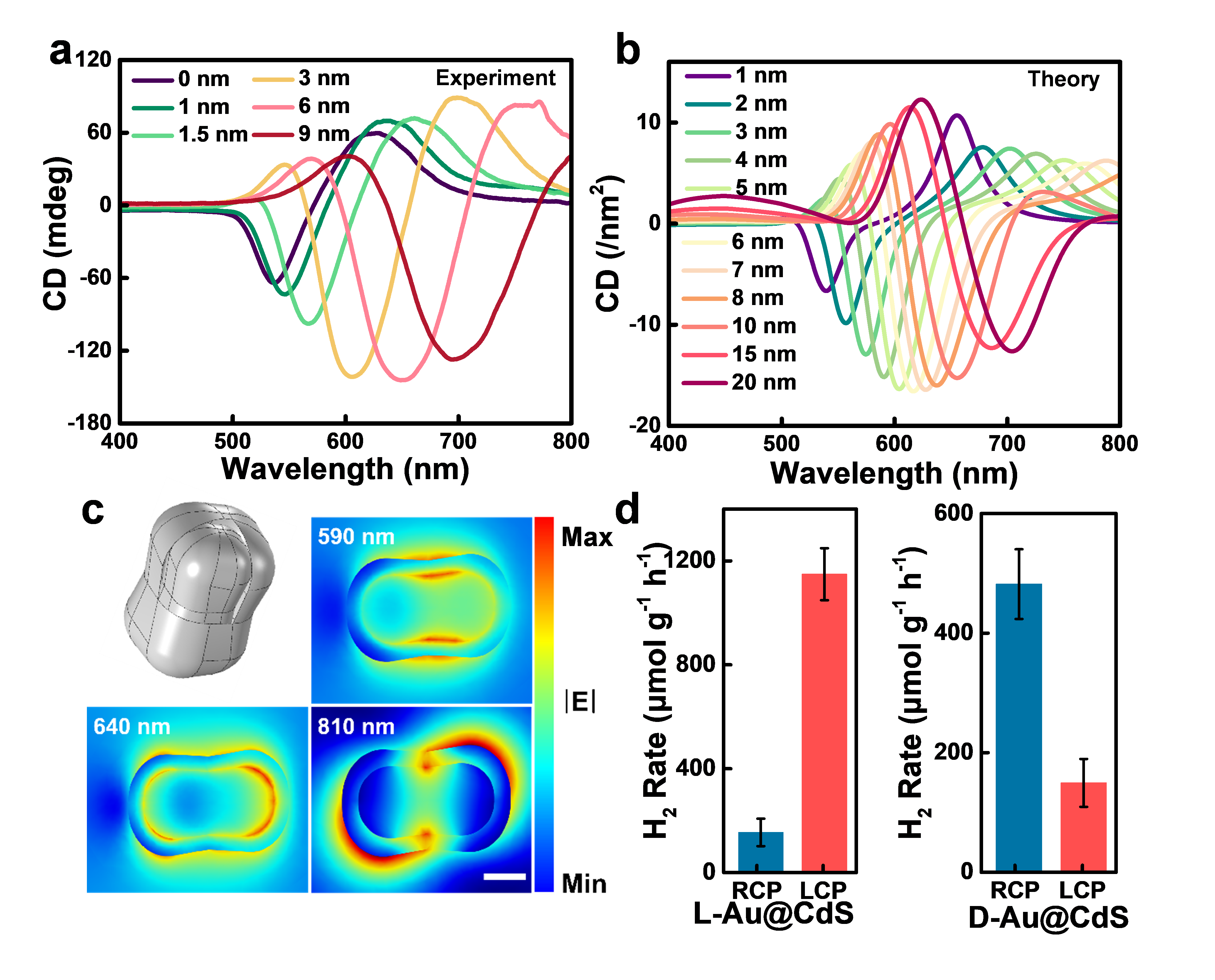 研究人员还进一步发现在两种不同圆偏振光激发下,制备的具有相反手性的手性无机异质纳米材料表现出显著不对称的光催化分解水产氢性能,例如,L-Au@CdS纳米材料在635 nm左旋圆偏振激光激发条件下表现出比右旋圆偏振光激发条件更为优异的光催化产氢活性(~7倍),而D-Au@CdS则呈现相反的趋势。这是迄今为止等离子体基异质纳米体系在手性依赖光催化产氢中的首次报道。这项研究有助于手性无机纳米材料的合理设计与功能化,加深人们对无机材料中的手性传递及手性光-物质相互作用的认识,并促进高效手性器件的开发。