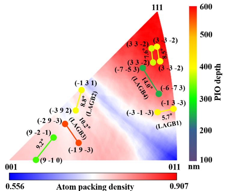 发展核电是改善能源结构,实现“双碳”目标的重要举措,而核电结构材料的安全服役是核电站安全可靠运行的根本保障。应力腐蚀开裂是核电结构材料的主要环境失效形式之一,而晶间氧化引起的晶界脆化是高温水中应力腐蚀开裂发生的重要前驱过程。同时,因为不同类型晶界的氧化敏感性差异显著,所以研究晶界结构对晶界氧化行为的影响对于材料寿命评估和应力腐蚀开裂抗力的提高具有重要意义。前期结果表明,600合金在高温水中腐蚀后,除共格孪晶表现出抗氧化性外,其他大角度晶界都会发生不同程度的氧化。然而,小角度晶界的氧化行为鲜有报道,是否存在临界取向差使得晶界在小于该取向差时表现出抗氧化性尚不清楚。