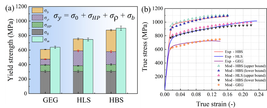 针对上述问题,西安交大金属材料强度国家重点实验室孙军院士团队博士研究生张崇乐、张金钰教授、刘刚教授和青年教师匡杰以d电子轨道理论设计合金成分,在保持单相固溶体的情况下构建出两种异质结构,进一步提升了单相亚稳β钛合金的综合力学性能。在成分设计上,考虑到合金的变形机制决定其宏观力学性能,因此设计出同时具有位错滑移和变形孪晶的合金成分,以期望通过位错滑移提供高强度,变形孪晶提供大塑性。在结构设计上,利用晶粒再结晶过程的动态性,以热轧辅以短时固溶处理,控制微观结构异质性(晶粒尺寸和位错密度),巧妙构筑出表层再结晶+芯部非再结晶的异质层状结构(HLS)和表层再结晶+芯部部分再结晶的异质双峰结构(HBS)。随后,从异质结构软硬区的协同变形效应对变形孪晶/位错滑移的激活和力学性能进行了深入的分析。研究结果表明,与传统的GEG(再结晶等轴晶粒)钛合金相比,具有最高背应力的HBS钛合金表现出最高的强度,而HLS钛合金表现出强度和延展性的最优结合。此外,位错滑移首先发生在HLS钛合金中,而孪晶首先发生在HBS和GEG钛合金中,这分别与预先位错密度和孪晶触发的尺寸效应密切相关。进一步证明位错工程和异质结构设计的结合可使亚稳β钛合金具有出色的强度-延展性平衡。最后,在本构模型中引入晶粒尺寸和位错密度的异质分布,并联合塑性变形过程中软硬区的各向同性硬化和随动硬化,合理解释了异质结构引起的性能提升,如图1所示。与先前报道的单相亚稳β钛合金相比,精心设计的异质结构和变形机制的组合(孪晶+滑移)使目前的HLS和HBS钛合金力学性能均优于传统的等轴β钛合金,如图2所示,并为单相合金的强韧化提供了一种新途径,可适用于其它单相合金体系并具有极大的工业应用潜力。