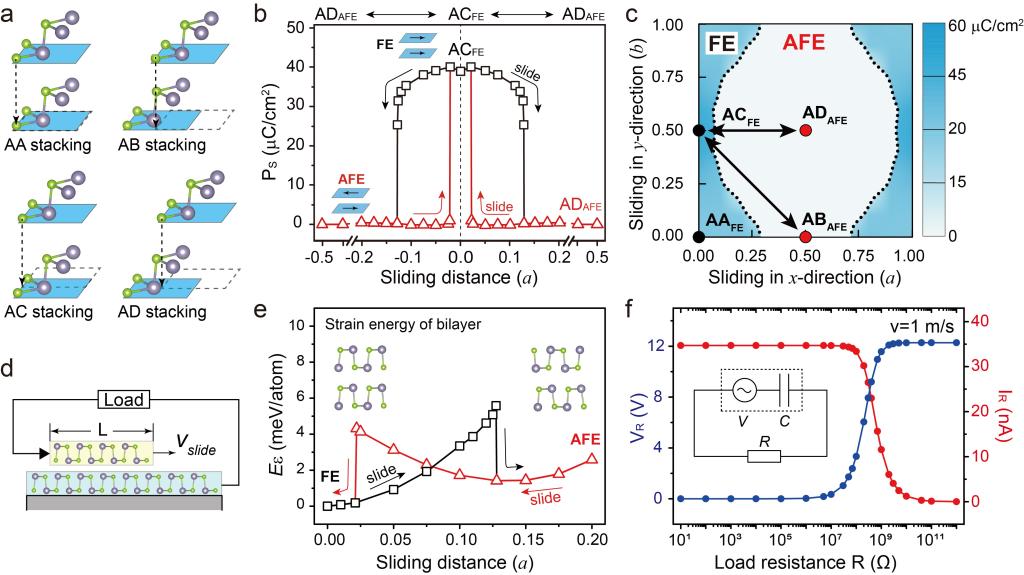 近日,3003新葡的京集团强度室的邓俊楷教授同澳大利亚墨尔本大学Zhe Liu副教授合作研究,通过第一性原理计算,在具有皱褶结构的双层IV-VI族二维材料MX(M=Ge, Sn; X=S, Se)中,发现了层间滑移诱发的面内可逆铁电-反铁电相变现象。深入分析发现,通常看似较弱的层间范德华力可以引起MX面内晶格发生畸变,在层间滑移过程中导致上层MX的面内共价键发生重构,诱发极化方向翻转,从而实现铁电和反铁电之间的相互转变。此外,基于该物理现象,提出了利用层间滑移诱发铁电-反铁电相变的纳米发电机模型。由于滑移过程中,能够产生高达40μC/cm2的铁电极化变化,同时借助二维范德华材料的超润滑特性,理论上可以产生巨大的电信号输出。计算表明其理论输出功率高于二维压电材料约四个数量级,表明了IV-VI族二维层状材料在纳米尺度的力电能量转换器件方面具有巨大的潜力。