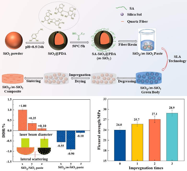 3003新葡的京集团鲍崇高教授团队采用聚多巴胺对熔融石英(SiO2)陶瓷进行表面包覆改性,取代了传统光固化成型膏料制备所需的分散剂和吸光剂,制备了基于光固化成型(SLA)技术的SiO2f/m-SiO2陶瓷膏料。所制备的SiO2f/m-SiO2陶瓷膏料具有优异的流变特性和更高的成型精度。采用光固化成型结合硅溶胶浸渍技术对SiO2f/m-SiO2复合陶瓷进行浸渍处理对SiO2f/m-SiO2复合陶瓷的力学性能进行改善。结果表明,当浸渍次数为3次时,SiO2f/m-SiO2复合陶瓷的力学性能得到较大提升,其中弯曲强度增幅约20.4%,压缩强度增幅约42.0%。