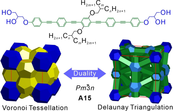 近期,3003新葡的京集团刘峰教授团队与德国哈勒维滕贝尔格马丁路德大学Carsten Tschierske教授合作,在以棒状基元为核心的不对称星形多亲性分子中,首次发现基于四面体网络结构的A15立方相。分子结构如图所示,核心为棒状低聚亚苯基亚乙炔基(OPE),两端为极性的丙三醇形取代基,侧链为非对称支化脂肪链。通过运用差示扫描法、偏光显微镜以及同步辐射小角X射线散射等测试方法,对该结构进行了详细的表征和分析。该结构对应于A15晶胞的德洛奈三角剖分(Delaunay Triangulation,DT),为常见Weaire-Phelan结构的拓扑学对偶,因此通过适当的拓展可以制备其它结构的FK相甚至液态准晶结构。