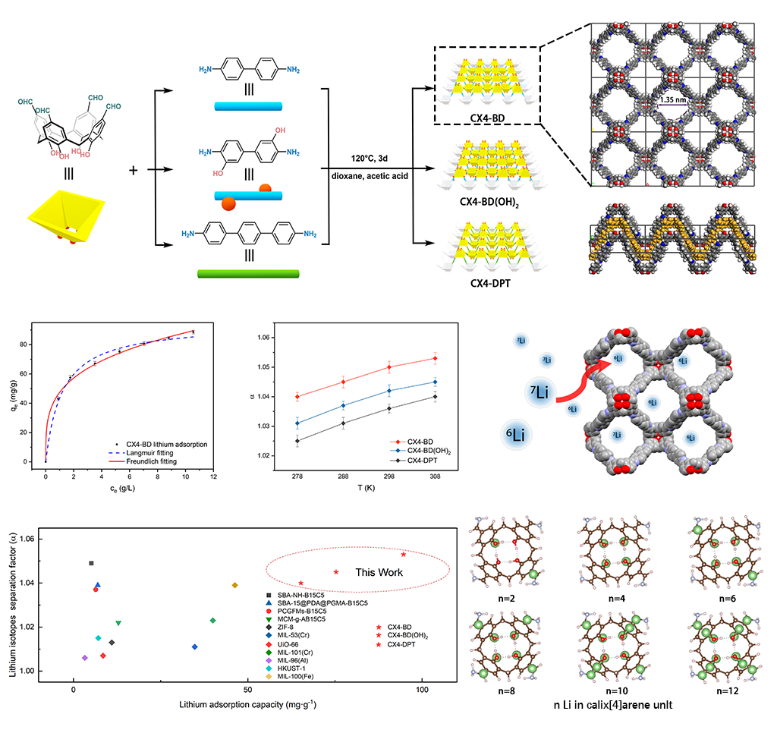 近日,3003新葡的京集团金属材料强度国家重点实验室刘学特聘研究员、丁向东教授与中科院高能物理研究所石伟群研究员合作提出杯芳烃锂同位素分离新体系。实验合成了三种杯[4]芳烃修饰的共价有机框架材料(COFs),该材料结晶性较好,具有波浪形二维层状结构及AA堆叠方式。该系列COFs对锂的吸附容量可达94.66 mg·g-1,锂同位素分离系数达到1.053±0.002,为目前报道的最佳材料。该工作首次证明了杯芳烃及COFs材料在锂同位素分离中的巨大潜力。密度泛函理论(DFT)计算及XPS谱图分析证明高锂吸附容量来自于杯芳烃结构上丰富的活性吸附位点。这项工作为杯芳烃基COFs的进一步应用提供了新的方向,同时也为设计制备具有高吸附性能和高同位素分离水平的锂同位素分离材料开辟了新的道路。