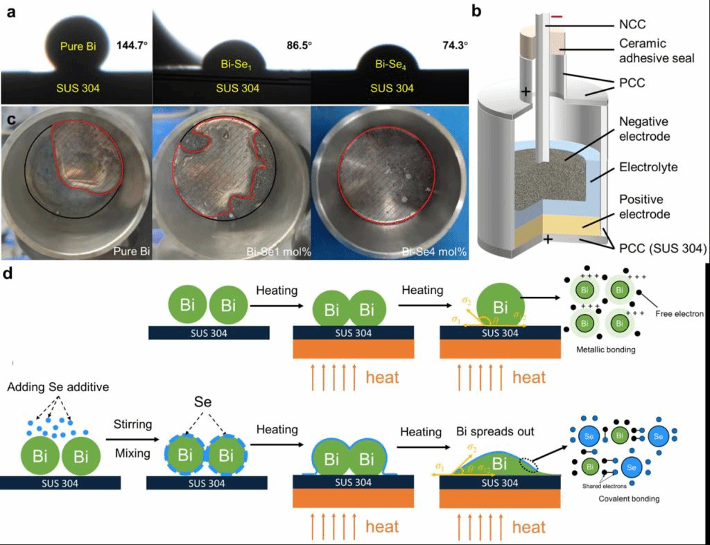 图1 Bi-Se正极在不锈钢电池壳上的润湿行为。(a)Bi,Bi-Se1,Bi-Se4在不锈钢基底上的接触角;(b)电池结构示意图;(c)Bi,Bi-Se1,Bi-Se4在电池壳底的铺展情况及(d)润湿性改善机制。
