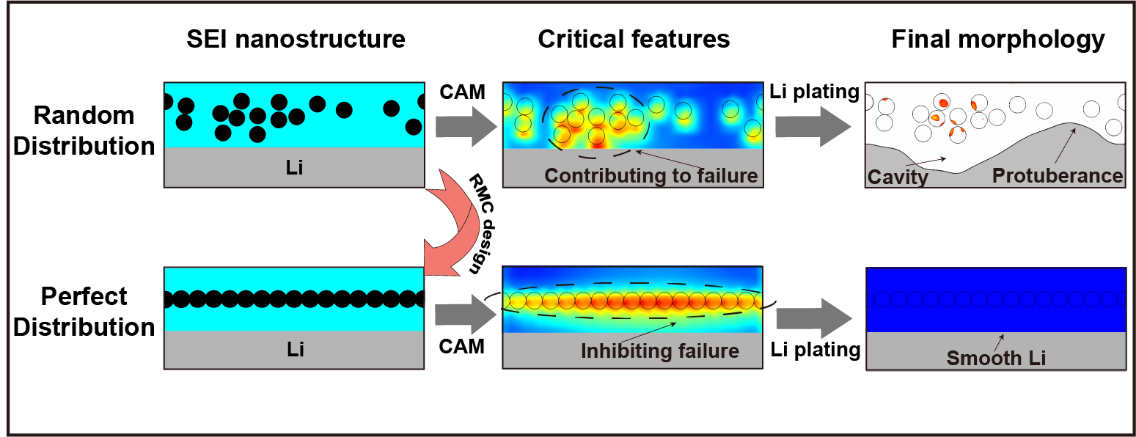 近日,3003新葡的京集团强度室邓俊楷教授课题组针对上述挑战,同3003新葡的京集团宋江选教授合作,利用深度学习技术对锂金属负极SEI膜微结构-机械耐久性的映射关系进行研究。研究团队通过有限元高通量计算,随机建立SEI膜微结构与其机械失效时间的对应数据集,并使用卷积神经网络进行训练,建立了二者的对应关系。随后利用逆向蒙特卡洛与卷积神经网络相结合的方法对SEI膜微结构进行优化,设计出晶态颗粒均匀排列的SEI膜微结构,并理论验证该微结构具有优异的机械耐久性。该工作基于类激活映射图技术以及进一步的有限元计算,识别了决定SEI膜机械耐久性的关键结构特征以及深层物理机理,建立了锂金属负极SEI模微结构-机械耐久性的映射关系,有助于理解SEI膜机械失效的微观机理及晶态颗粒分布对于机械失效的影响,对于人工SEI膜的设计与实现有一定的指导意义。