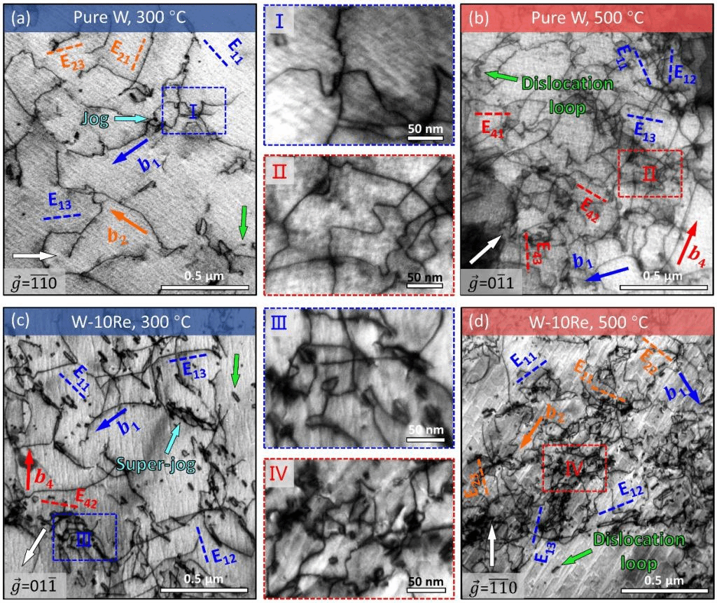 通过进一步的缺陷表征发现,随着温度升高,位错增殖能力的突然增加使得纯W发生了脆韧转变(Lu Y, et al. PNAS 118 (2021) e2110596118, Zhang YH, et al. JMST 141 (2023) 193–198)。然而,合金化后,Re元素在高温下促进了螺位错的局部交滑移,从而产生了横跨多个滑移面(三维结构)的超割阶和位错环。这些缺陷结构的密度和分布不仅和Re元素的含量相关,而且还表现出明显的温度依赖性:Re含量和变形温度越高,缺陷的密度越高(如图3所示)。高密度的三维不可动缺陷(超割阶和位错环)强烈地阻碍了位错的运动,最终导致W-Re合金高温变形能力下降、韧脆转变温度升高。