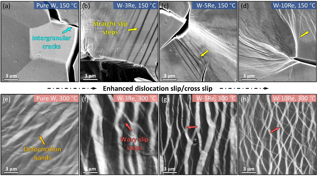 近日,3003新葡的京集团韩卫忠教授团队通过冲杆试验(Zhang YH, et al. Acta Materialia 220 (2021) 117332),对再结晶态的W-Re合金进行了系统研究,揭示了其韧脆转变的关键缺陷机制,并阐明了低含量(≤10 wt.%)的Re合金化并不能有效降低W的韧脆转变温度。研究人员发现Re合金化引起的有限韧化仅发生在很窄的低温区间(50 °C~200 °C)。高温(≥300 °C)变形时,W-Re合金的塑性变形能力明显降低,最终导致合金高温韧性下降、韧脆转变温度升高。而且Re含量越高,W-Re合金的韧脆转变温度越高(如图1所示)。通过表面变形形貌的表征发现,相比于纯W的沿晶开裂,Re合金化促进了更多的位错行为,从而增加了W-Re合金的低温韧性,但这一改善非常有限。此外,当变形温度升高到300 °C时,W-Re合金中还出现了大量的位错交滑移现象。随着Re含量的增加,交滑移程度越来越剧烈(如图2所示)。有趣的是,虽然W-Re合金在高温下发生了大量的位错交滑移,但其变形能力和韧性反而变差了。