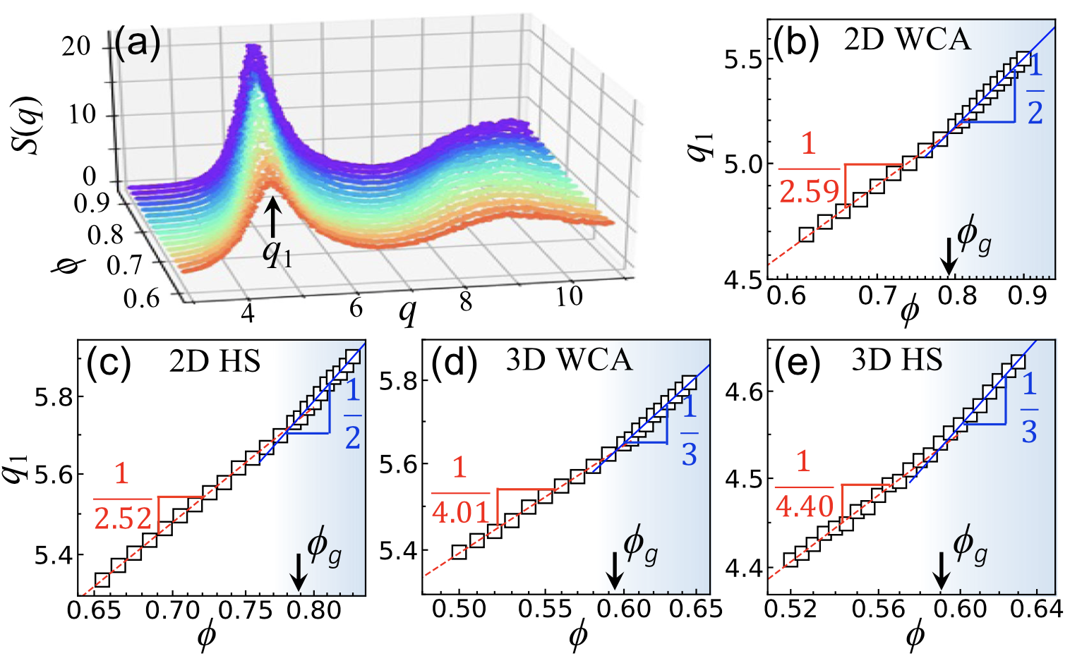 图2. 结构因子幂律va ∝ q1−d揭示玻璃转变过程从液体d > D 到玻璃态d = D.