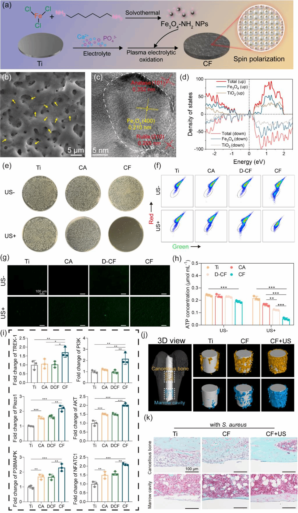 图2. 异质结的制备过程(a)、表面形貌(b)、HRTEM图像(c)、态密度(d)、抗菌性能(e)、不同样品超声过程中细菌膜电位的流式细胞术散点图(f)及细菌的胞内ROS荧光染色图像(g)、细菌在不同样品上的ATP含量(h)、成骨细胞在不同样品上TREK-1和Piezo1相关蛋白的离子通道表达(i)、体内骨髓炎模型中植入6周后细菌感染种植体的Micro-CT图像(j)以及种植体周围组织的番红O-固绿染色(j)。统计学差异采用单因素方差分析(ANOVA)和事后Tukey检验(*p < 0.05, **p < 0.01, ***p < 0.001)。