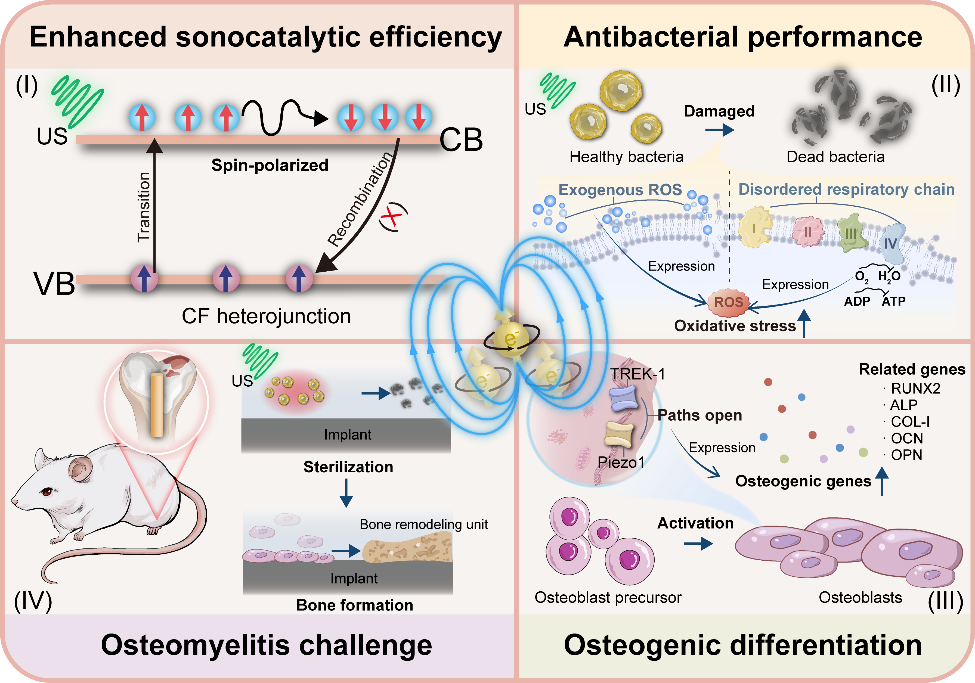 图1. 异质结中的自旋极化电子在促进ROS生成、抗菌、成骨分化和骨髓炎治疗中的作用示意图