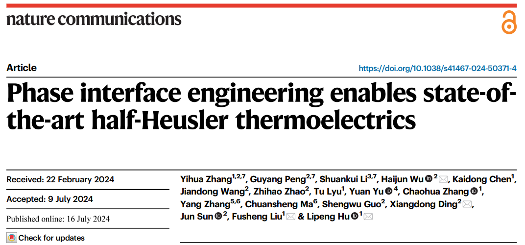 相关成果以《相界面工程优化半哈斯勒合金性能》(“Phase interface engineering enables state-of-the-art half-Heusler thermoelectrics”)为题发表在《自然·通讯》(Nature Communications)上。我校为该论文第一通讯作者单位,我院武海军教授、丁向东教授和深圳大学刘福生教授、胡利鹏副教授为共同通讯作者,我院22级博士生张仪华和23级博士生彭古扬为论文共同第一作者。该研究得到了国家重点研发计划项目、基金委面上项目、西安交大青年拔尖人才计划等项目的支持。感谢我校分析测试共享中心在电镜定性和定量结构表征和分析的鼎力支持。