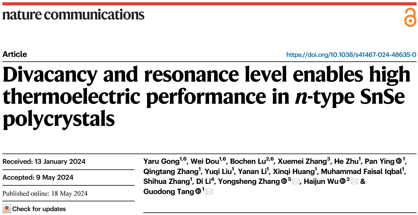 该研究成果以《双空位和共振能级优化n型SnSe多晶体热电性能》(“Divacancy and Resonance Level Enables High Thermoelectric Performance in n-Type SnSe Polycrystals”)为题发表于《自然·通讯》(Nature Communications 2024, 15, 4231)。武海军教授、曲阜师范大学张永胜教授和南京理工大学唐国栋教授为共同通讯作者,3003新葡的京集团硕士生逯伯琛为共同第一作者。该研究得到了国家重点研发计划项目、基金委面上项目、西安交大青年拔尖人才计划等项目的支持。感谢我校分析测试共享中心在电镜定性和定量结构表征和分析的鼎力支持。