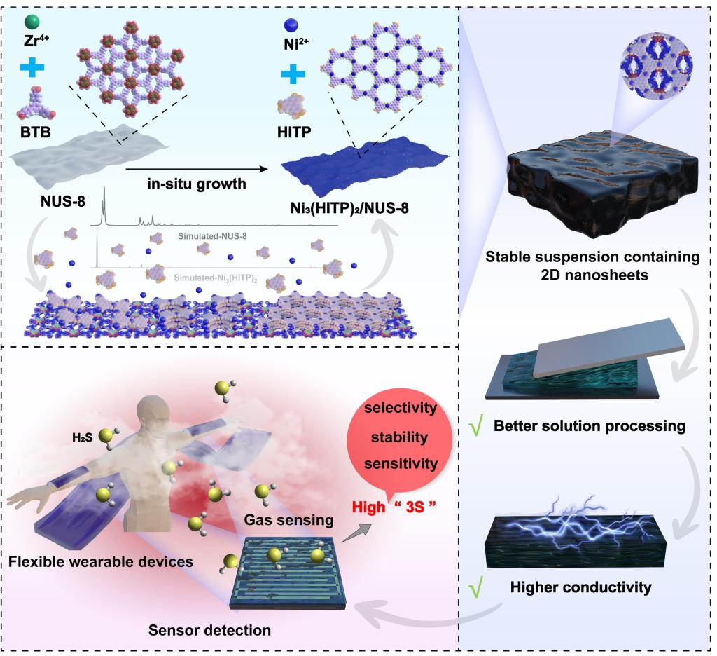图1. Ni3(HITP)2/NUS-8合成策略示意图及其在多维传感中的应用