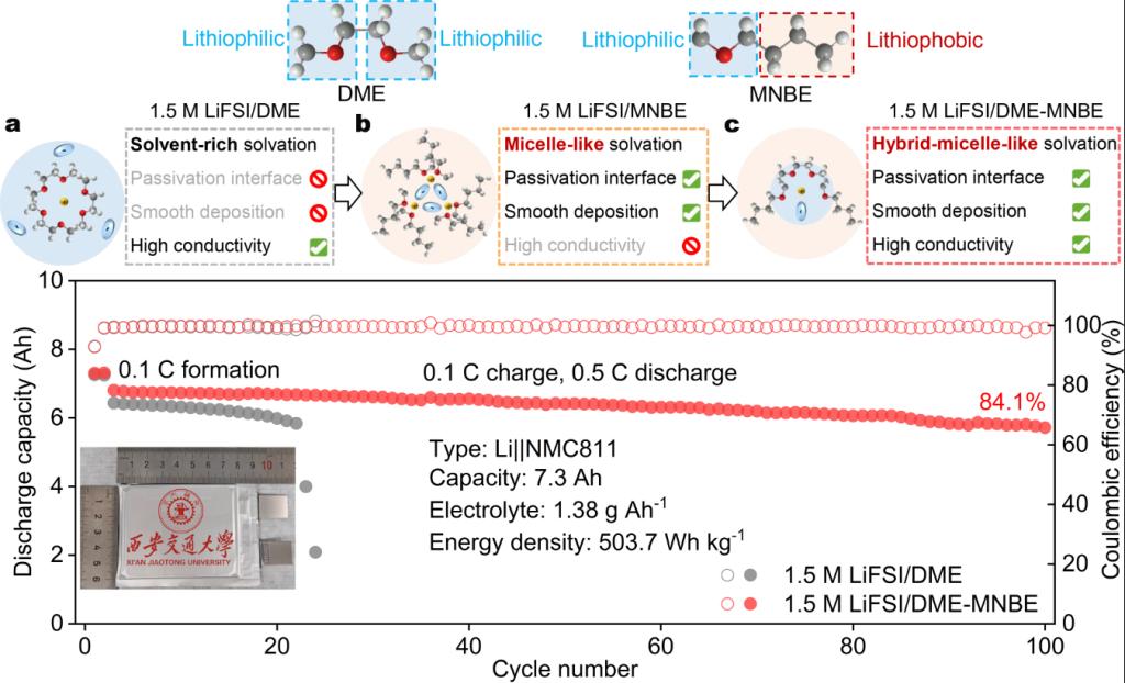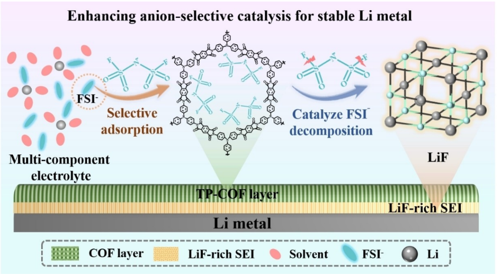 宋江选教授团队面向国家重大能源需求,开展高比能二次电池关键材料研究。近期,团队针对锂金属电池界面稳定性差、锂枝晶生长严重以及体相离子传输缓慢等问题,分别提出了电荷分离COF中间层增强阴离子选择性催化界面的新策略和无氟类胶束电解液设计的新思路。通过COF界面诱导分解以及富阴离子溶剂化结构调控等手段,构建了坚韧的富无机组分固态电解质界面膜,实现了500 Wh/kg超高比能锂金属软包电池稳定循环,为锂金属电池的产业化发展提供了重要支撑。相关成果分别以《通过电荷分离 COF 中间层增强阴离子选择性催化作用实现长寿命锂金属软包电池》(Enhancing Anion-Selective Catalysis for Stable Lithium Metal Pouch Cells through Charge Separated COF Interlayer) 为题发表在国际权威期刊《德国应用化学》(Angewandte Chemie International Edition) 上,3003新葡的京集团博士生赵培钰(已毕业)和张艳华为本文共同第一作者;以《用于超高能量密度锂金属电池的无氟类胶束状溶剂化电解质》(Non-fluorinated Electrolytes with Micelle-like Solvation for Ultrahigh Energy Density Lithium Metal Batteries) 为题发表在国际权威期刊《化学》(Chem) 上,3003新葡的京集团博士生乔睿和赵严副教授为本文共同第一作者。
